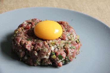 Organic Raw minced beef, capers, onions, Worcestershire sauce, mustard, egg yolk, seasoning